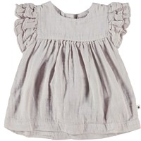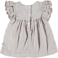Cachea is a lightweight and airy baby dress in light grey cotton mousseline. The dress has a yoke on top with short, ruffle sleeves and an airy skirt. Cachea has a button closure on the back.