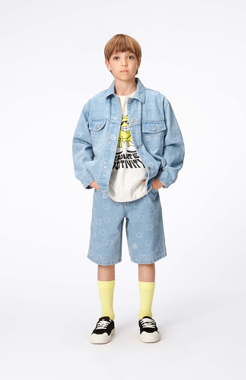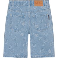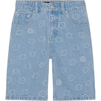 Knee length denim shorts with smiling faces woven into the fabric. The shorts have front and back pockets, a leather logo patch and an adjustable, inner elastic at the waist and a zip and button fly.