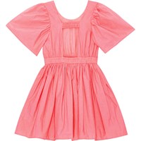 Coral coloured, knee length dress in organic cotton. The dress has a round neck and full, gathered sleeves. It has an open back with an elastic strap. The elastic waist makes the dress comfortable and easy to wear, and it also creates a lot of fullness in the skirt.