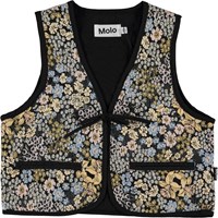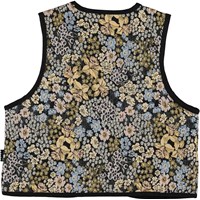 Black and multi-coloured quilted waistcoat in a floral jacquard that includes daffodils and forget-me-nots woven together with a lot of other flowers in yellow and blue pastel colours. This waistcoat is in 100% polyester, has a black edge tape and a tie at the front. It has a black lining and is in a regular fit. Wear it over a shirt, long sleeved t-shirt or a dress for a cool look.