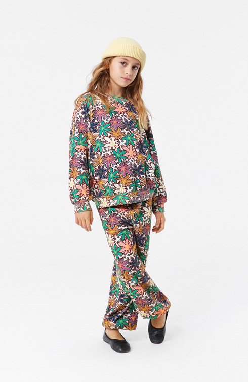 Off-white velour trousers in soft cotton with a regular fit and elastic waistband and cuffs. The trousers feature a beautiful multicoloured maple leaf print that blends into a large pattern.