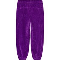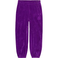 Purple velour trousers with Molo's embroidered clover. They have elastic at the waist and at the pant leg, which makes them very comfortable and easy to pull on.