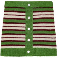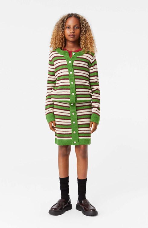 Knitted retro-striped skirt in a soft wool blend. The skirt is snug-fitting with an elastic waistband and lovely mother-of-pearl buttons as a detail on the front. Pair it with a matching cardigan to complete the set.