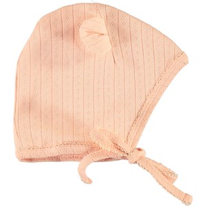 Coral-coloured baby hat in a needle-out pattern with attached ears. It can be tied closely to the face with ties underneath the chin.