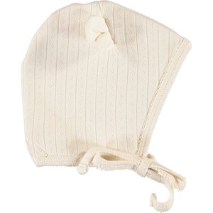 White baby hat in a needle-out pattern with attached ears. It can be tied closely to the face with ties underneath the chin.