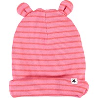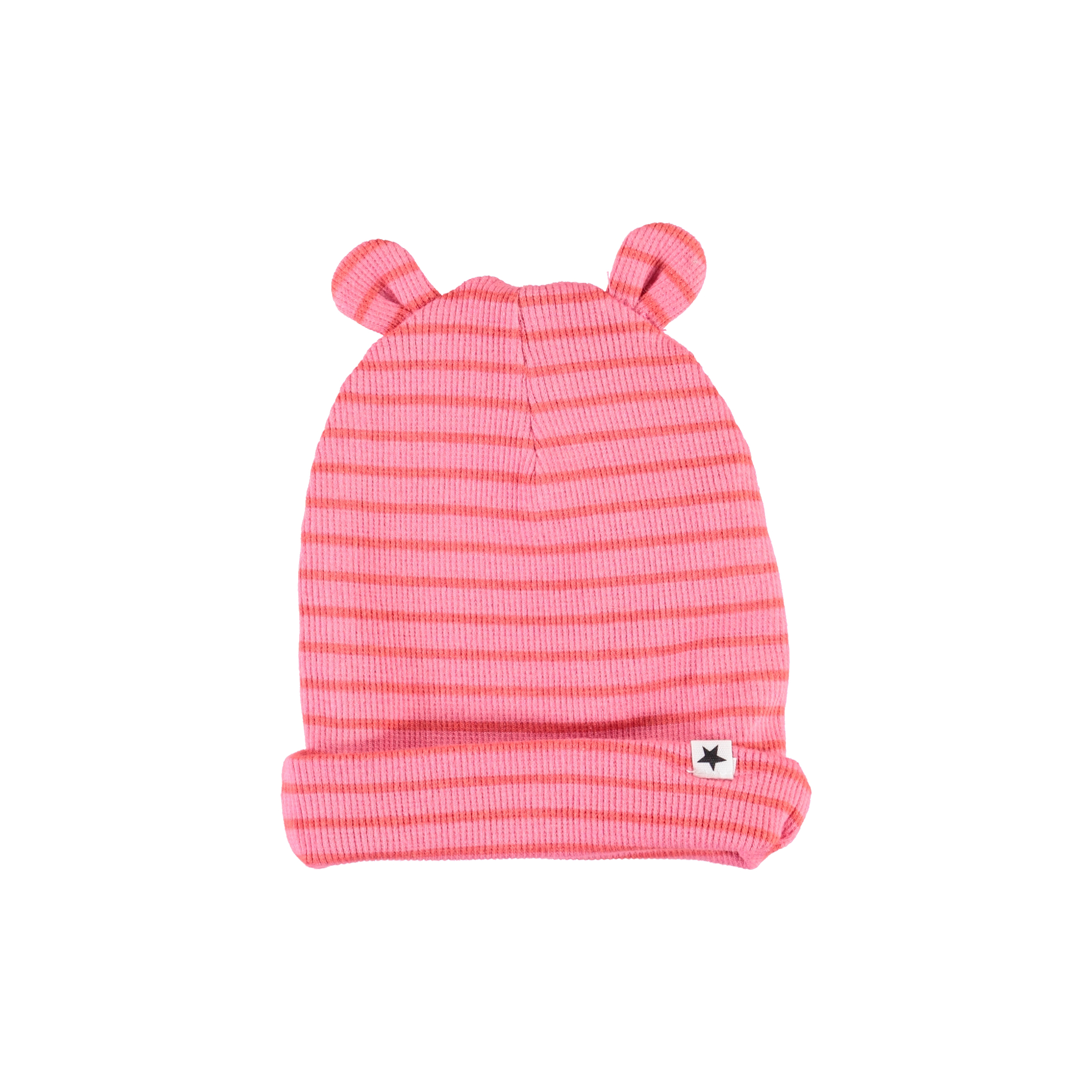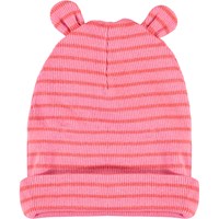 Baby hat in pink rib with red stripes. The hat has a roll up edge and small, attached ears.