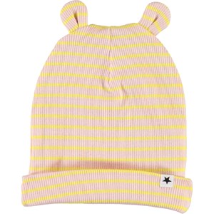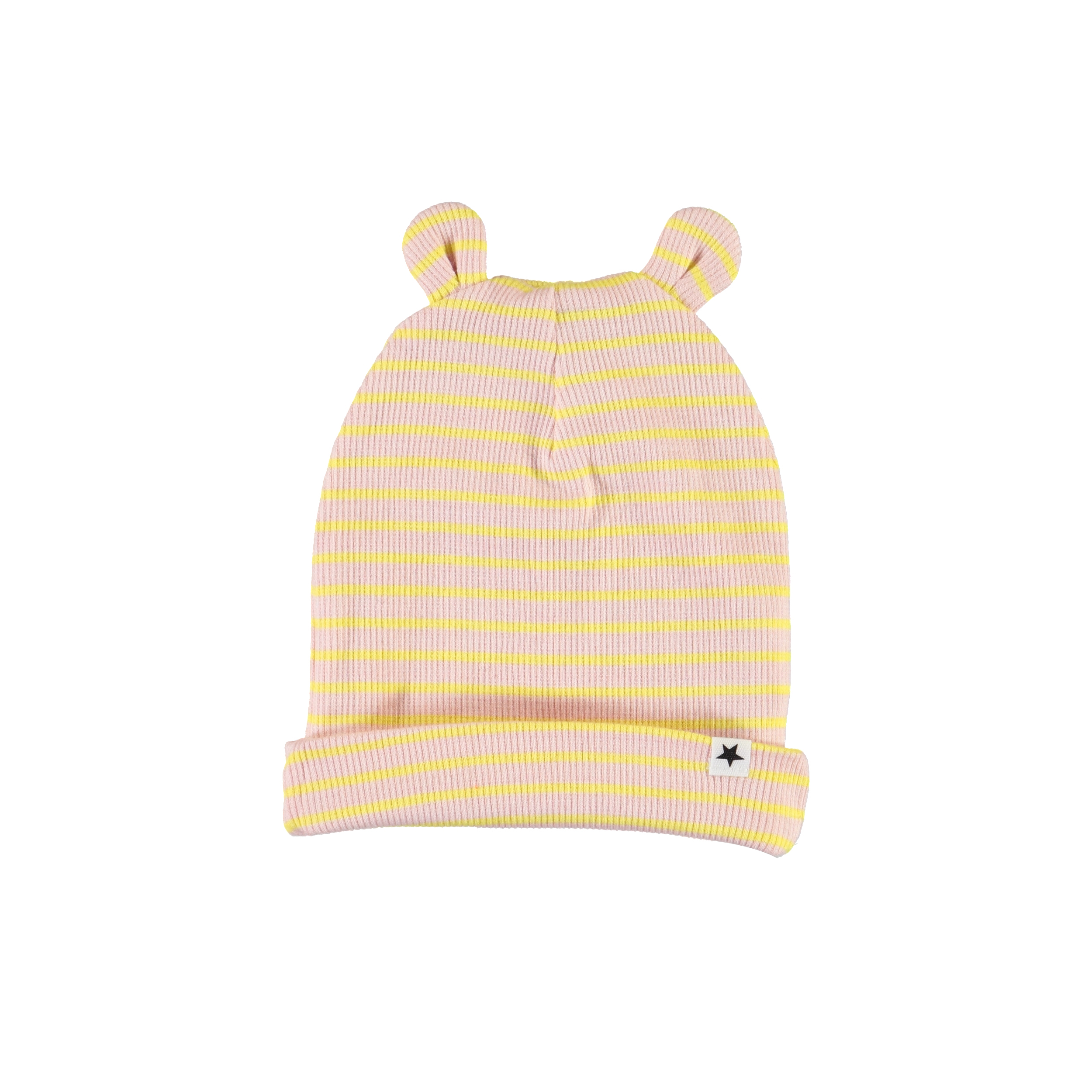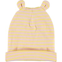 Baby hat in pink rib with yellow stripes. The hat has a roll up edge and small, attached ears.