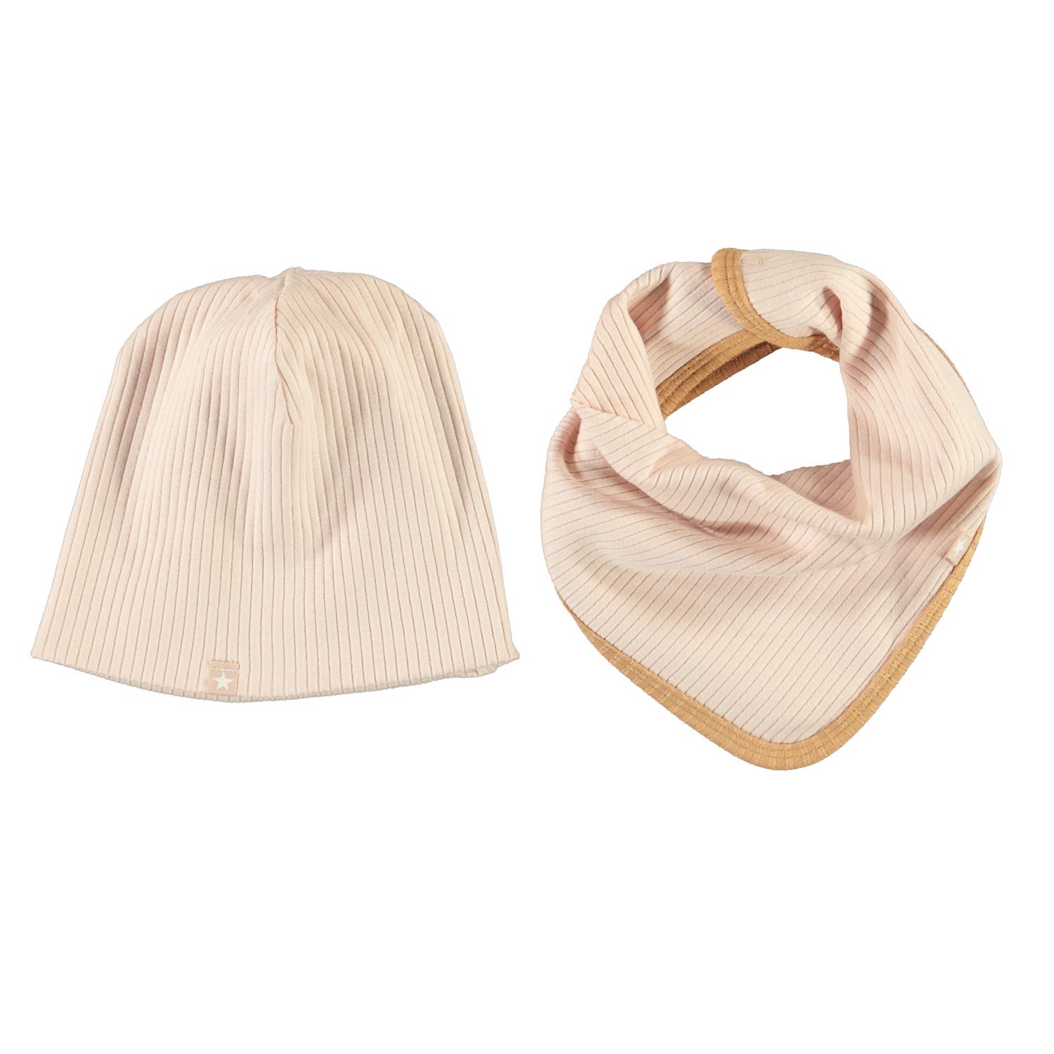 Pink baby hat and bib in a rib quality. It has a single snap closure at the neck and a brown edge. The hat and bib are made in organic cotton.