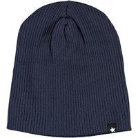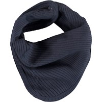 Blue baby hat and bib in a rib quality. The bib has a single snap closure at the neck.