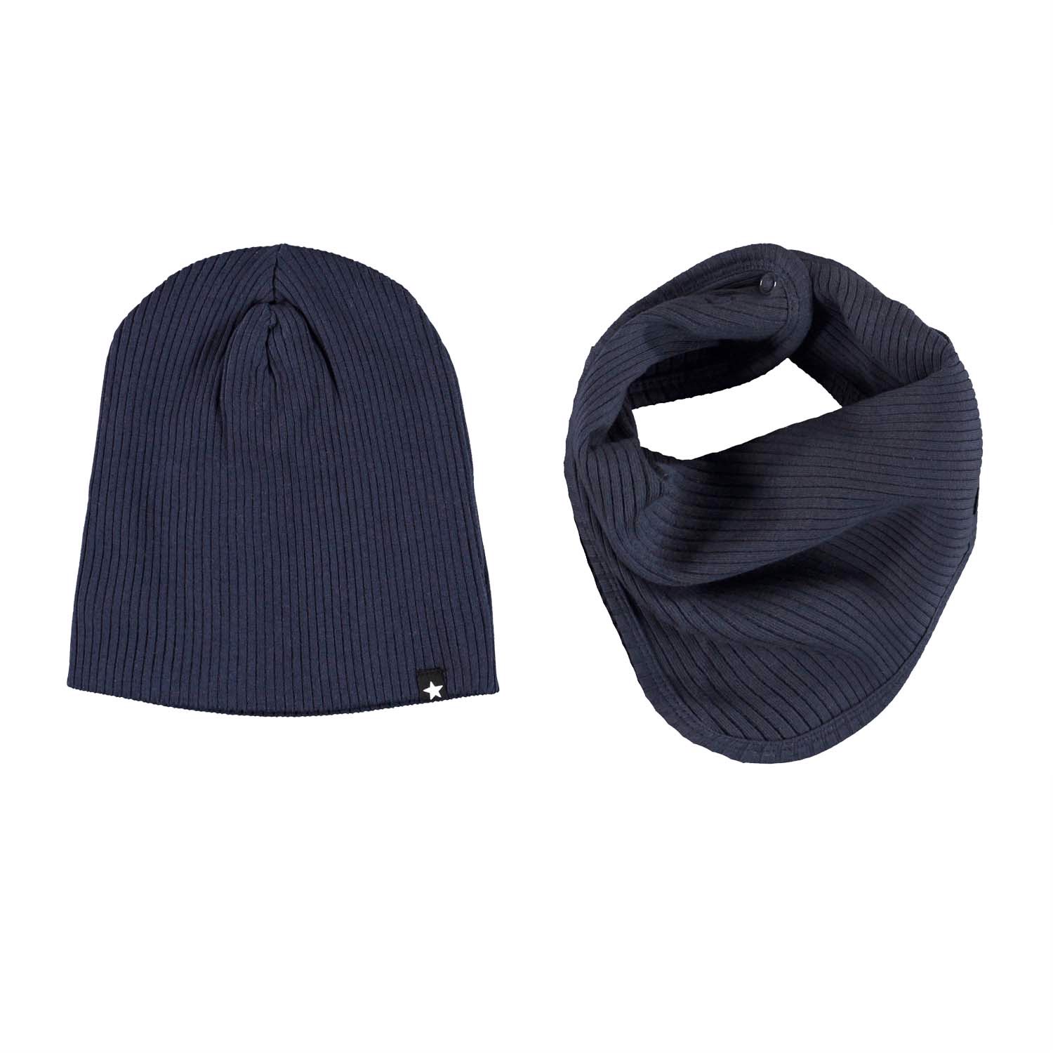 Blue baby hat and bib in a rib quality. The bib has a single snap closure at the neck.