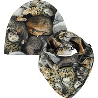 Baby hat and bib in yellow with a print of various animals that have taken a trip to the moon. The bib has a single snap clousre at the neck.