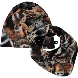 Baby hat and bib with a print of forest animals. The bib has a single snap closure at the neck.