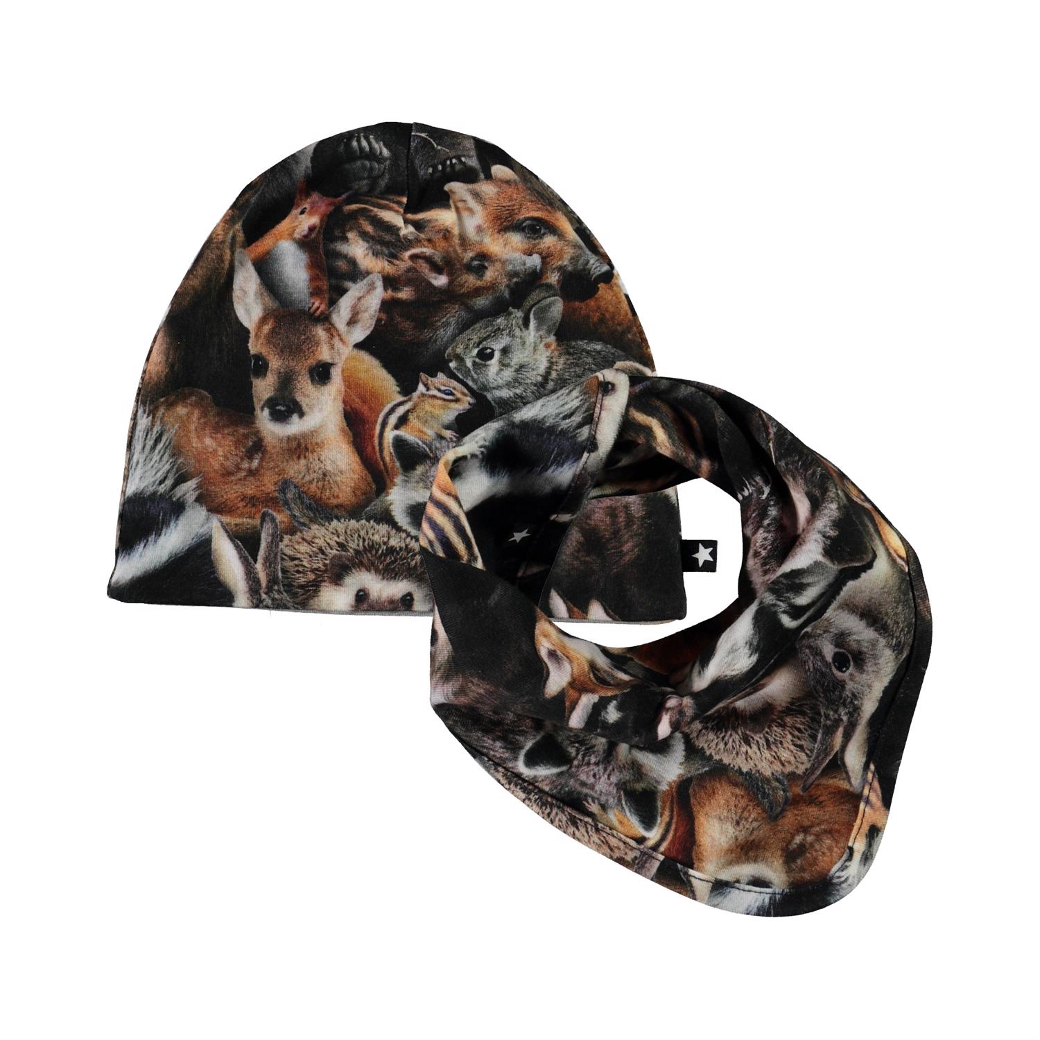 Baby hat and bib with a print of forest animals. The bib has a single snap closure at the neck.
