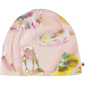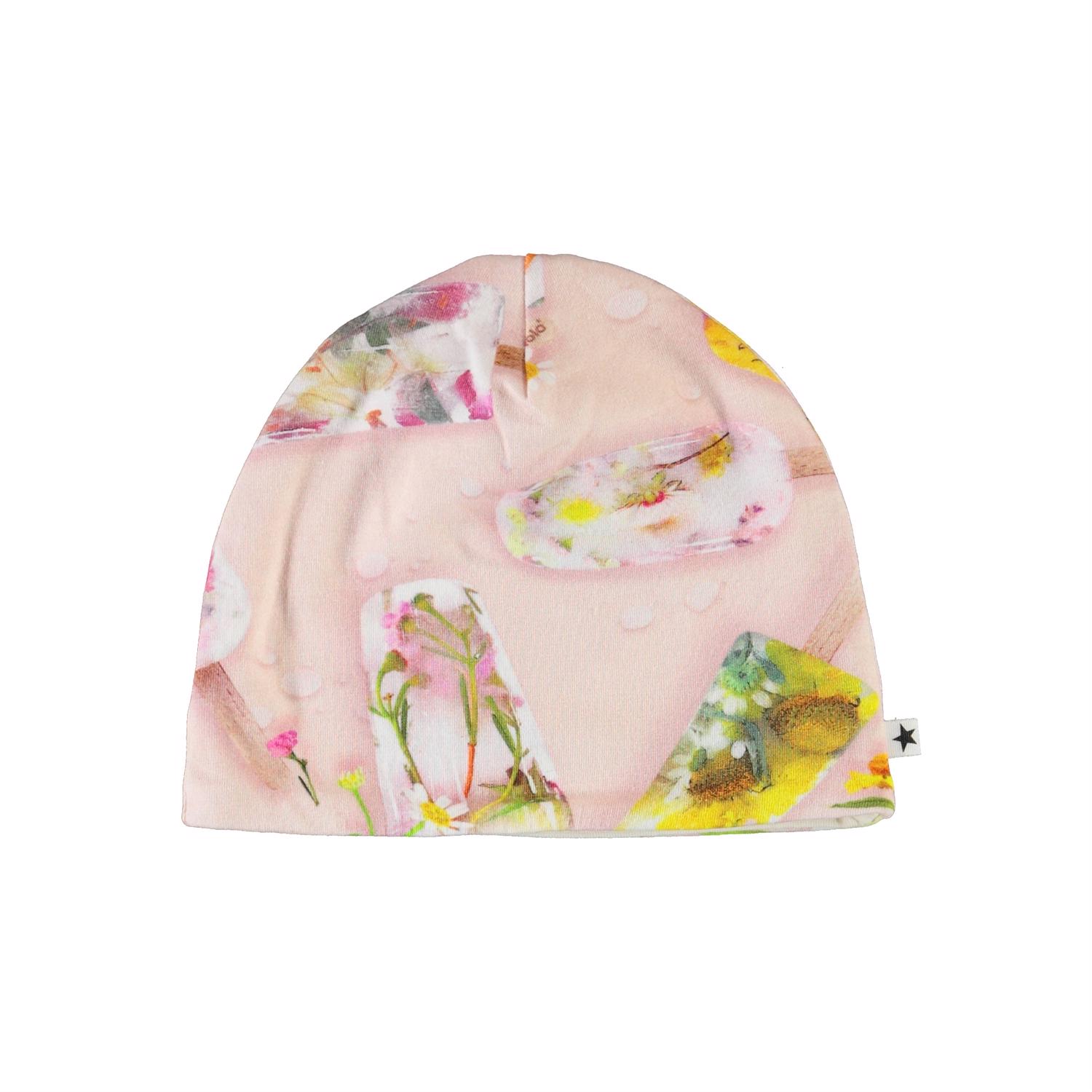 Pink baby hat with ice cream print. It can be used with or without roll up.