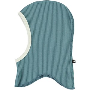 Light blue baby ski mask in a rib quality with a brown edge around the face. The hat is made of organic cotton.