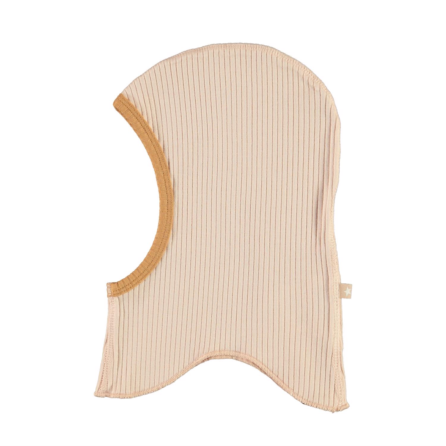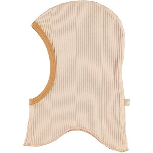 Rose coloured baby ski mask in a rib quality with a brown edge around the face. The hat is made of organic cotton.