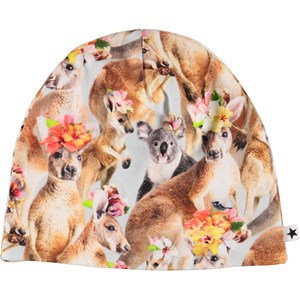 Hat in a print of kangaroos and koalas with flowers on their heads print.