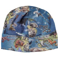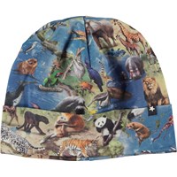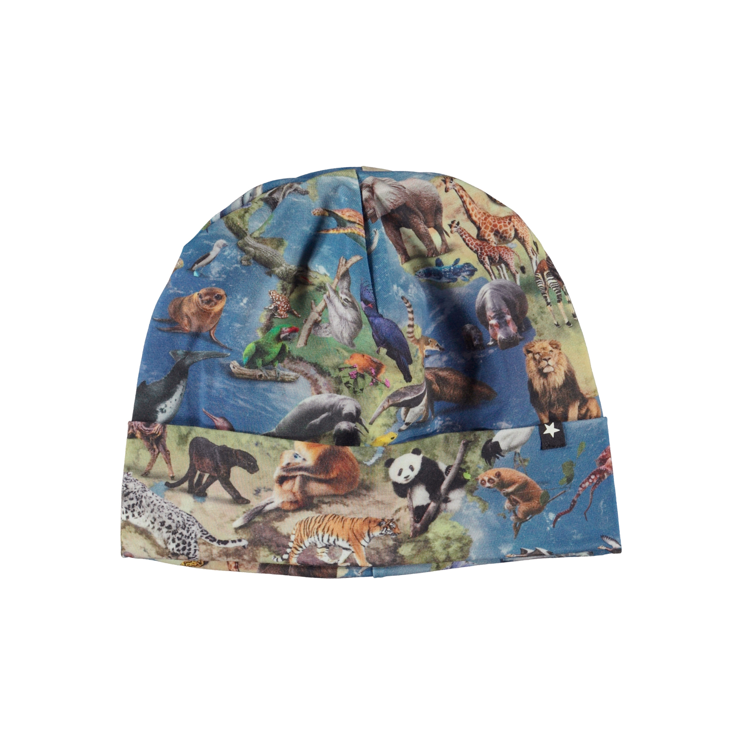 Nico is a soft, elastic hat in a double layer. It is in the all over Animal Earth print, which shows the Earth's continents and all the animals that live on land and in the sea. The hat can be worn rolled up or rolled down, and it's constructed in 100% organic cotton jersey.