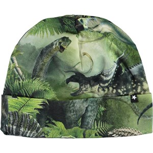 Soft, elastic hat in a double layer. It is in green with a print of a dinosaur. The hat can be used rolled up or down.