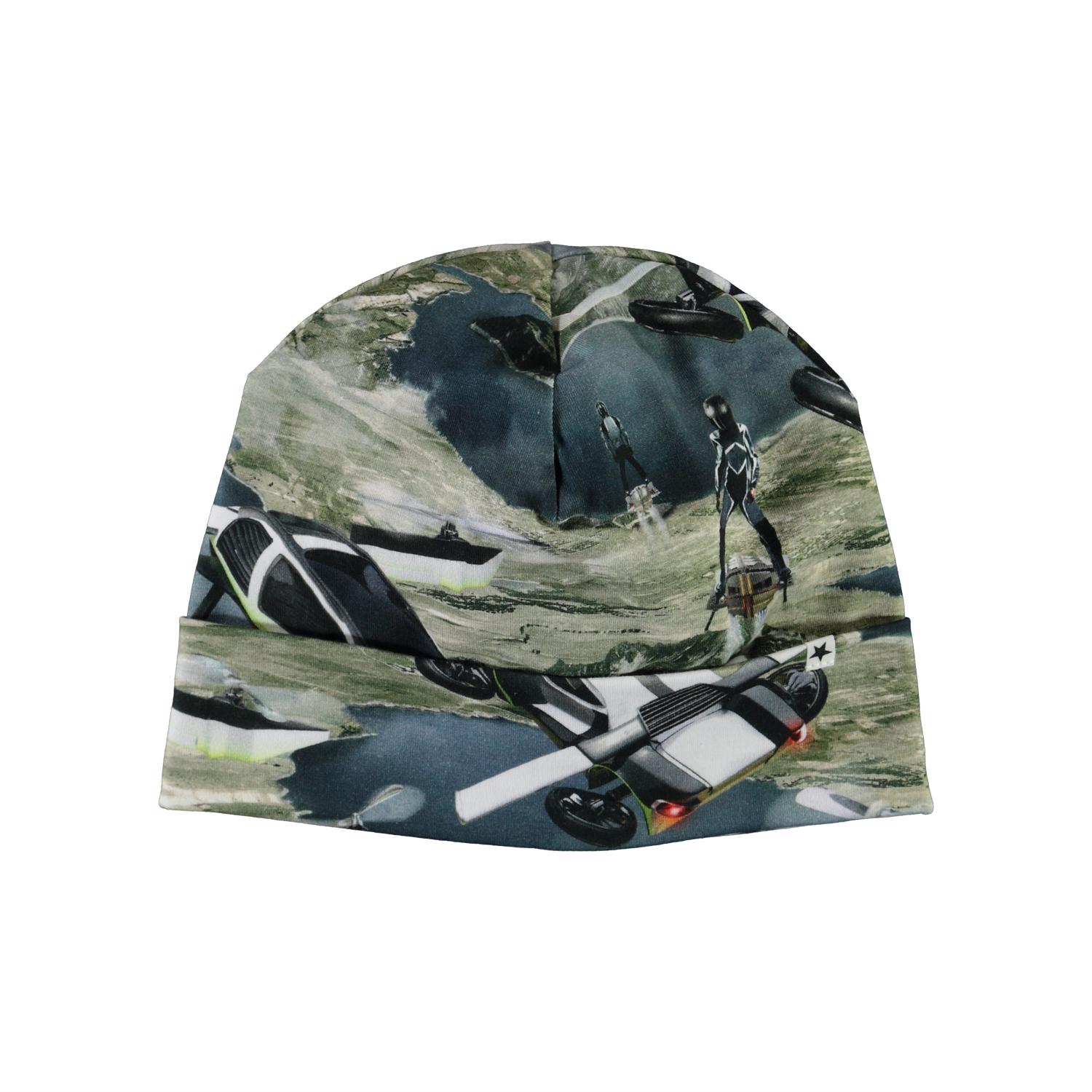 Soft, elastic hat in a double layer with a spaceship print. It can be used with or without roll up.