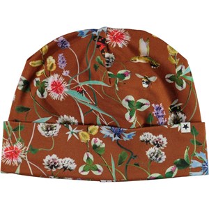 Soft and elastic double layer hat in brown with a floral print. It can be used with or without roll up.