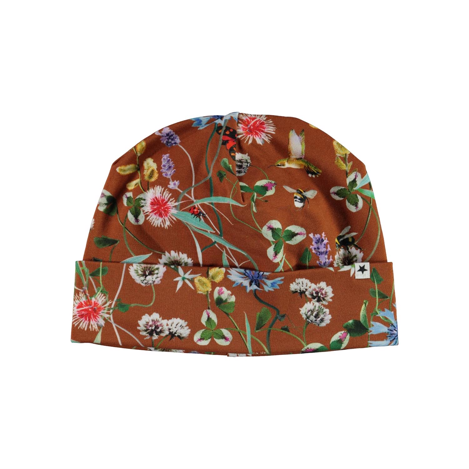 Soft and elastic double layer hat in brown with a floral print. It can be used with or without roll up.