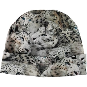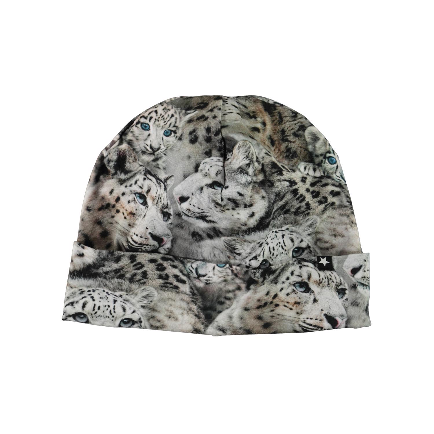 Soft and elastic double layer hat with a print of snow leopards. It can be used with or without roll up.