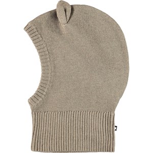 Beige knit ski mask with small, sewn on ears. The hat has a rib edge at the neck and around the face.