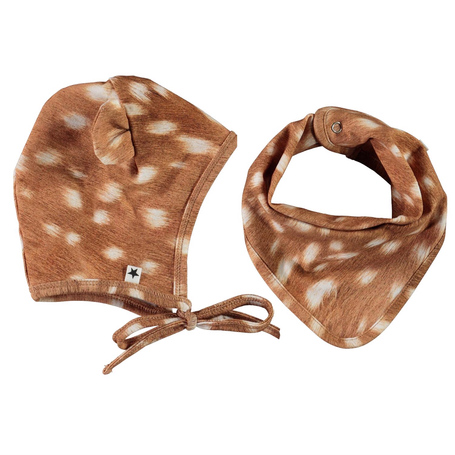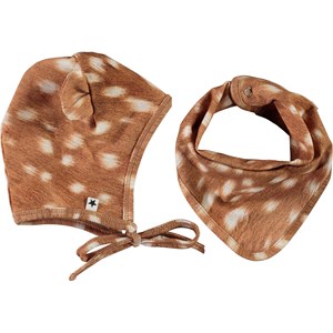 Baby hat and bib in brown with a print of white spots. It can be tied closely to the face with ties underneath the chin. The hat also has small, sewn on ears. The bib has a single snap closure at the neck.