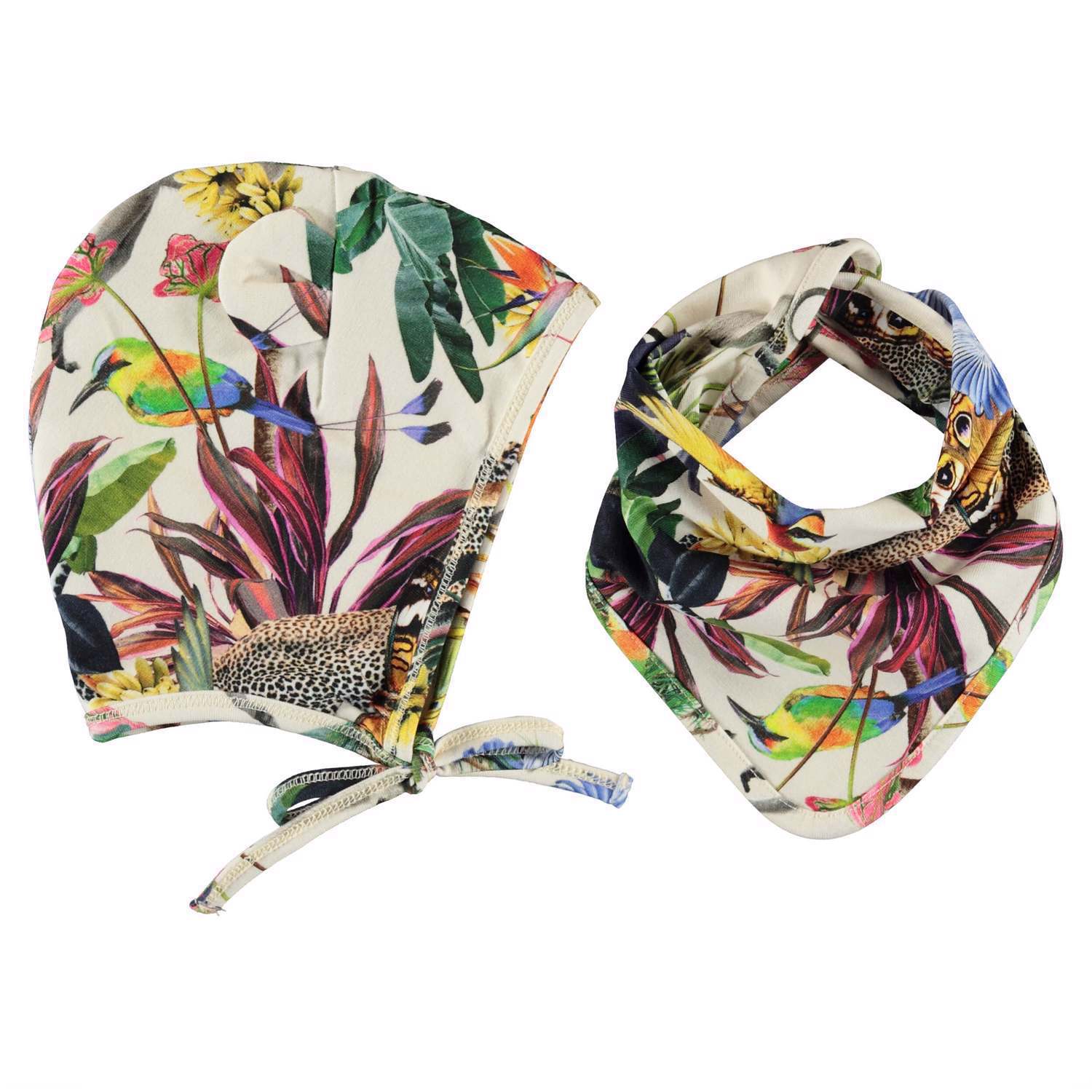 Baby bonnet and bib in white with a print of a colourful fantasy jungle. The bonnet can be tied closely to the face with ties underneath the chin. It has small, sewn on ears. The bib has a single snap closure at the neck.