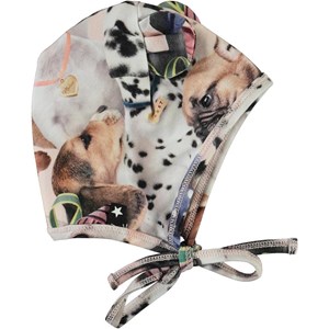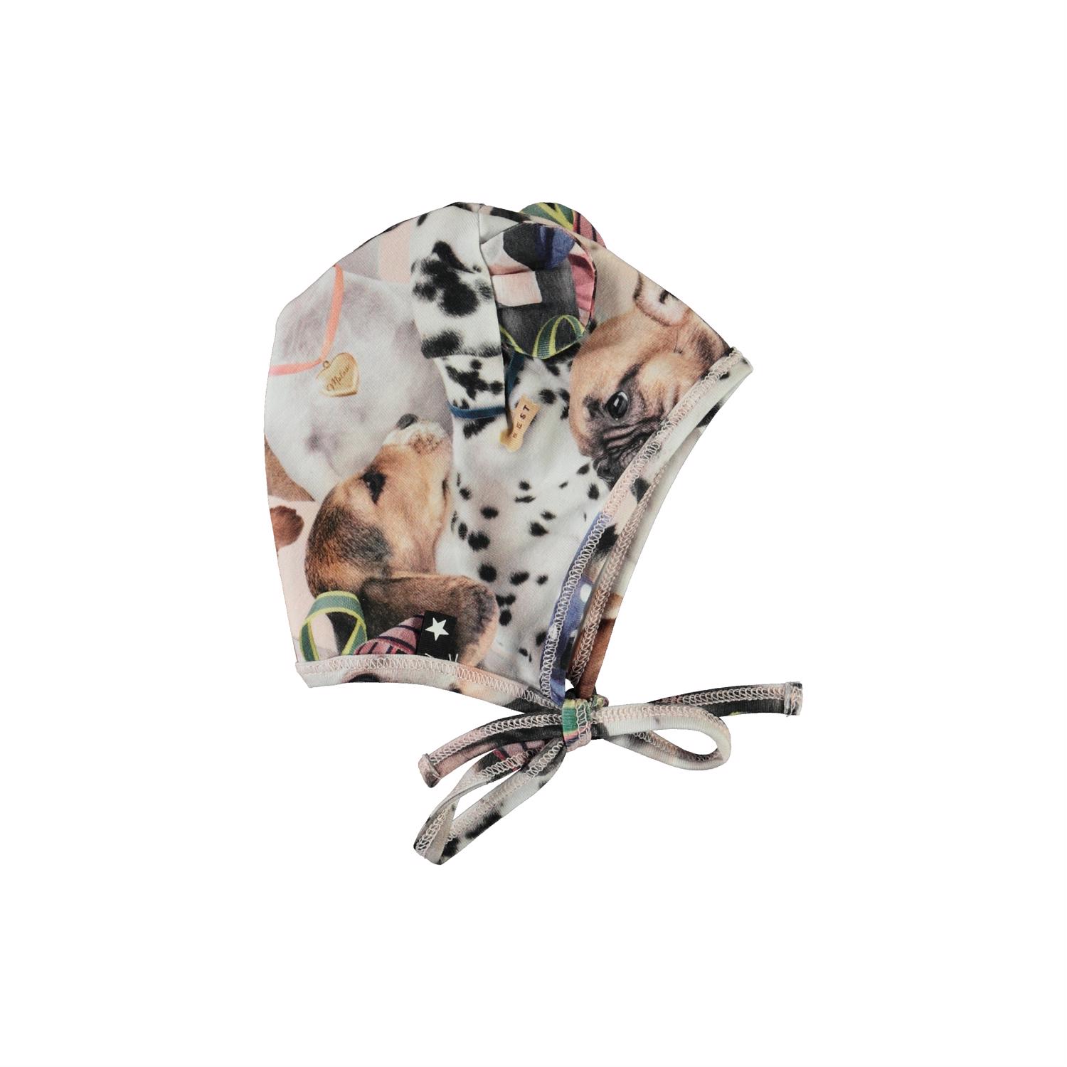 Baby hat with a print of small dogs with ribbons around their necks. It can be tied closely to the face with ties underneath the chin. The hat also has small, sewn on ears.