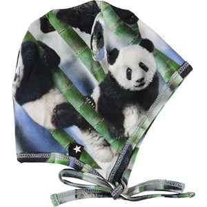 Baby hat with a panda bear print. It can be tied closely to the face with ties underneath the chin.