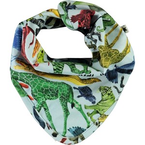 Light blue bib with a print of various animals. The bib has a single snap closure at the neck.