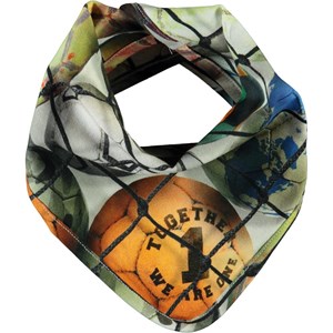 Bib with a print of colourful footballs. The bib has a single snap closure at the neck.