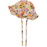 Nizana is a white baby hat with a ruffled brim and a print of apple branches. The hat has ties and is constructed in 100% organic cotton jersey.