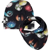 Baby hat and bib with a print of footballs. The bib has a single snap closure at the neck.