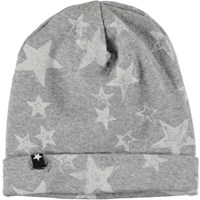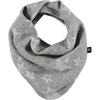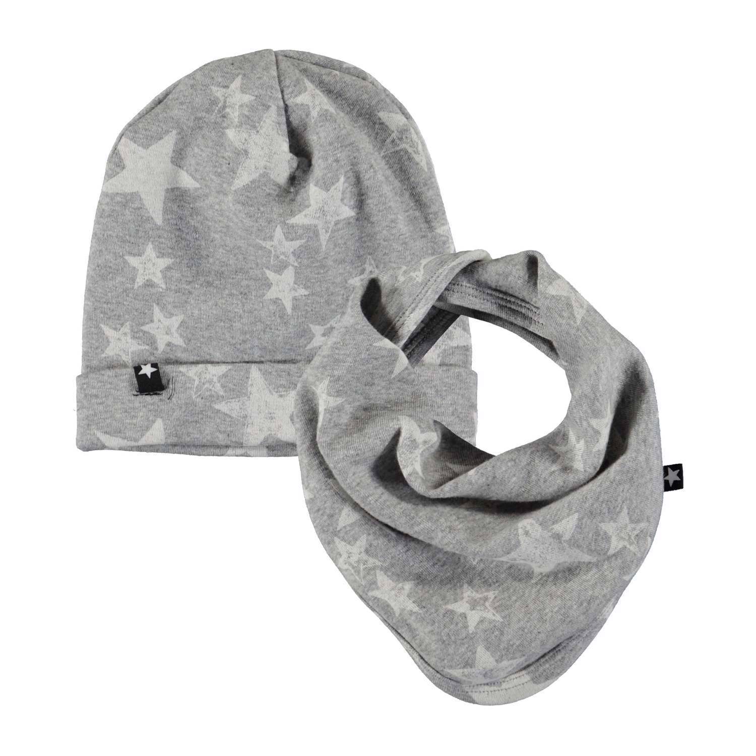 Baby hat and bib in different grey colours with a star print. The bib has a single snap closure at the neck.