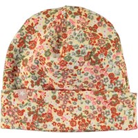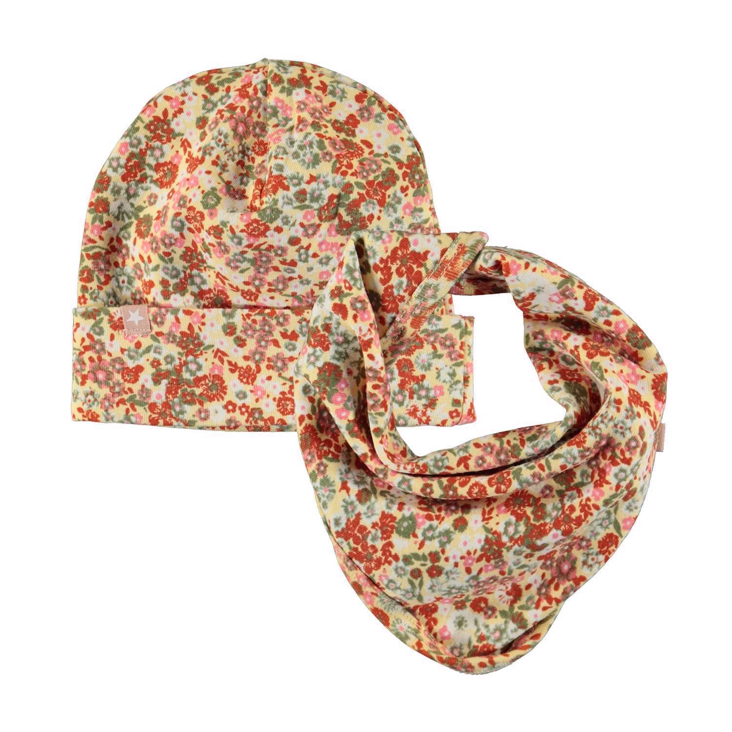 Baby hat and bib in small floral print. The bib has a single snap closure at the neck.