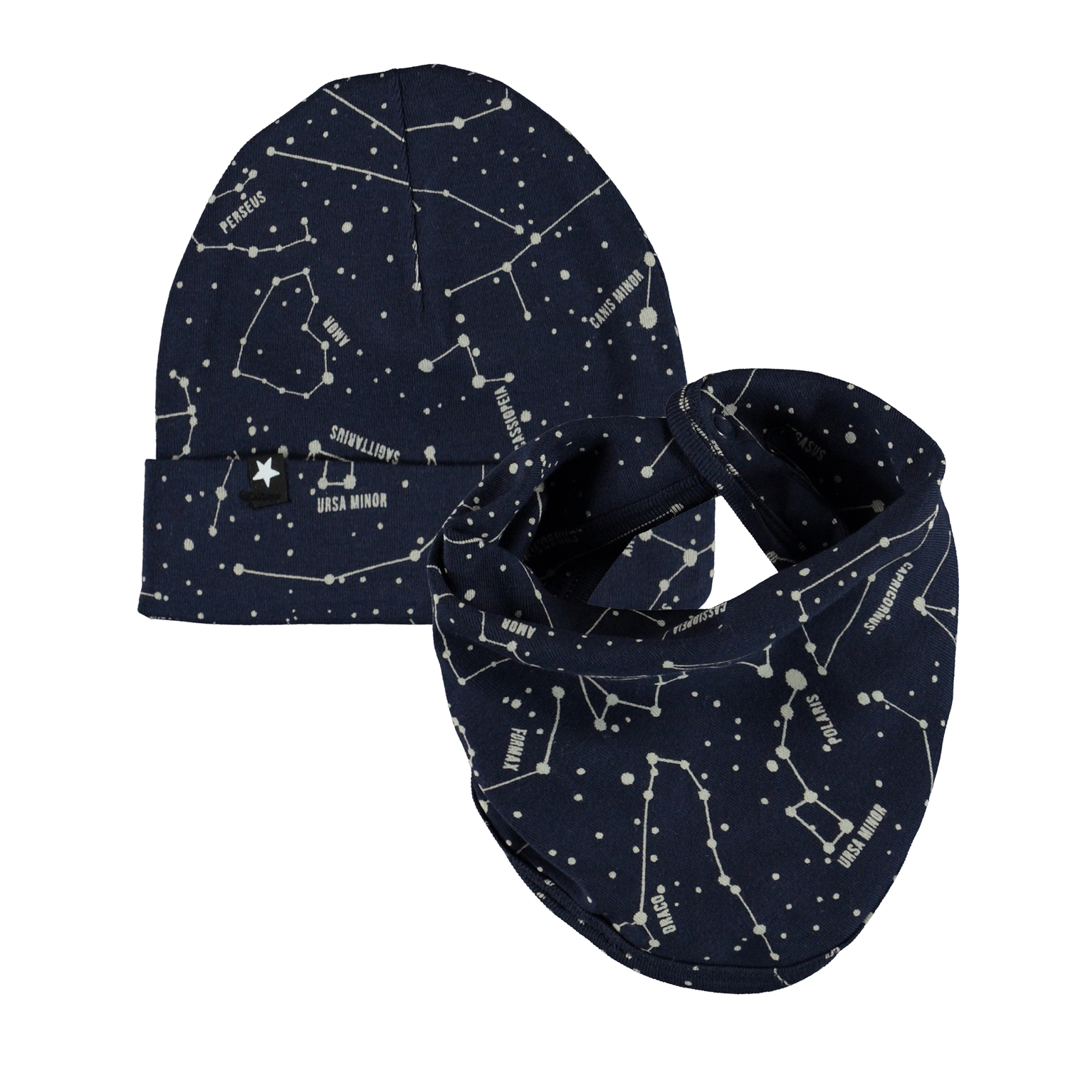 Baby hat and bib in dark blue with a print of a star map. The bib has a single snap closure at the neck.