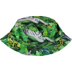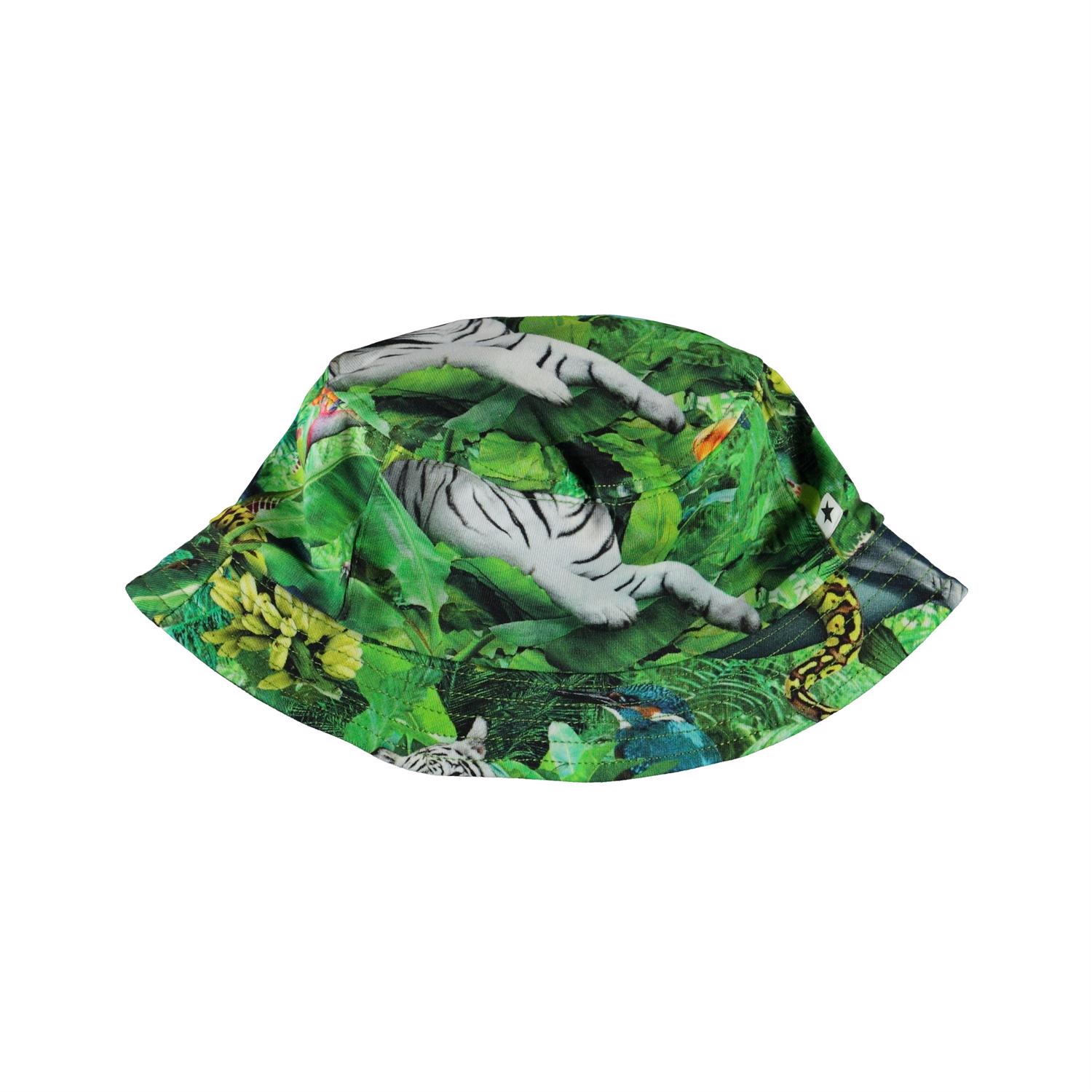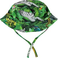 Green bucket hat with a jungle print with hidden animals. Size guide: 3-5 years = 49 cm, 6-8 years = 51 cm, 9-14 years = 53 cm.