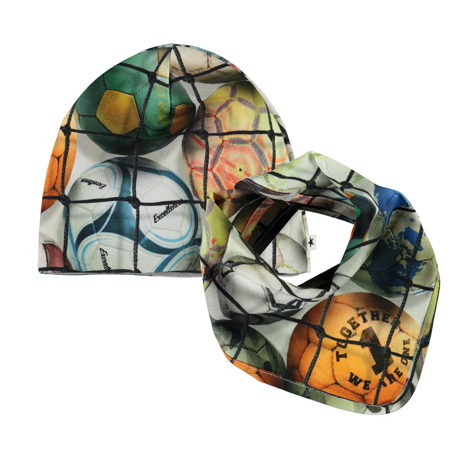 Baby hat and bib with a football print. The bib has a single snap closure at the neck.