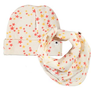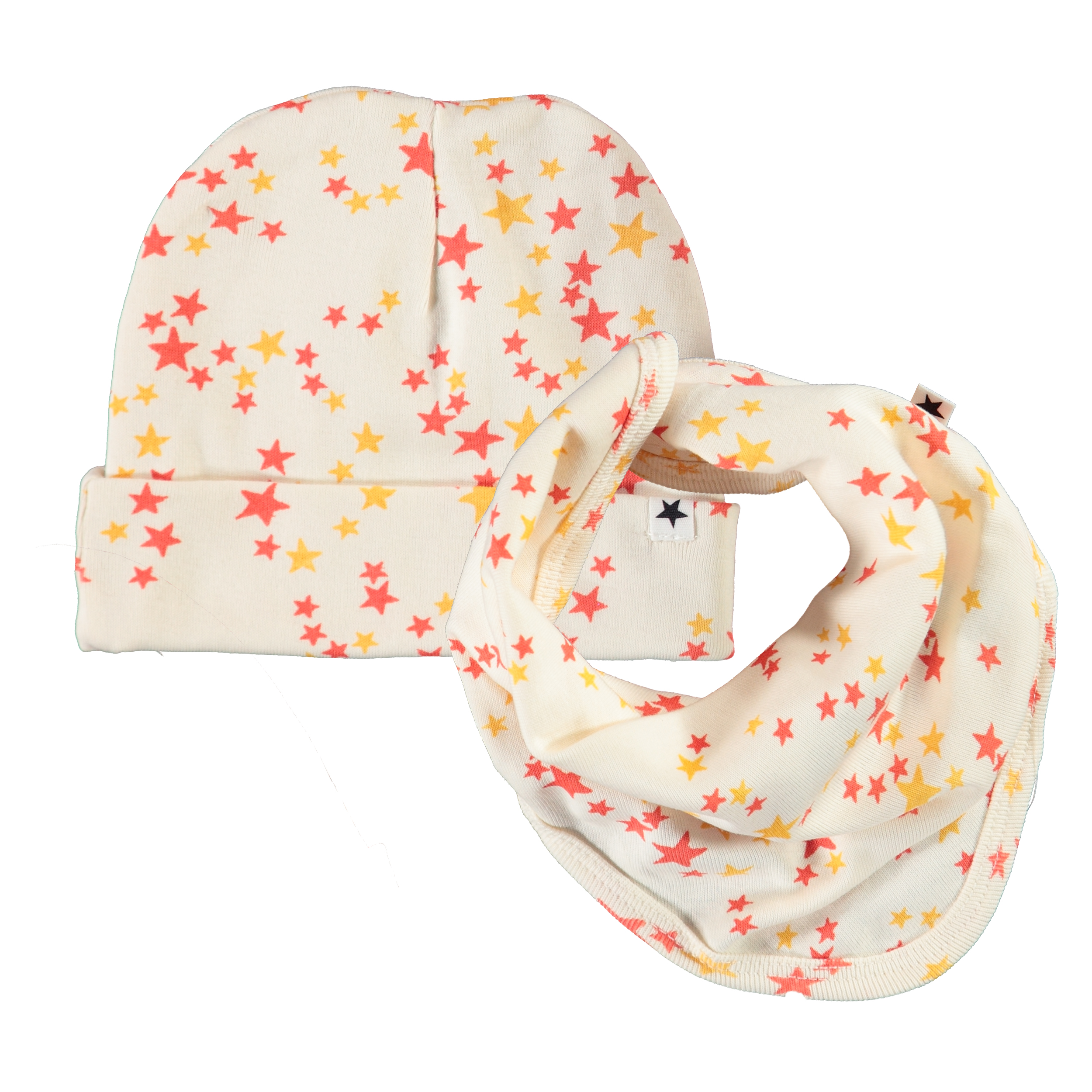 Baby hat and bib with a print of small stars. The bib has a single snap closure at the neck.