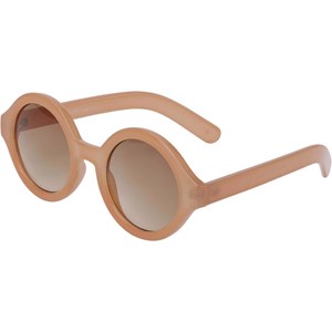 Coral coloured sunglasses in a round shape with dark lenses. Molo's sunglasses have 100% UV protection. Sizes 7-16 years.