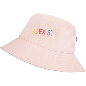 Pink bucket hat with the text 'co-exist' printed in different colours on the front.