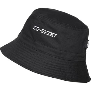 Reversible, black bucket hat that is white on the other side. It has a text that says 'co-exist' on the front. The bucket hat has a wide brim for protection from the sun. It is a must-have summer accessory.