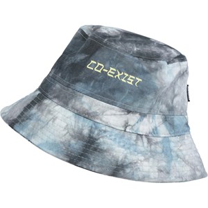 Blue tie-dye bucket hat. It has a text that says 'co-exist' on the front. The bucket hat has a wide brim for protection from the sun. It is a must-have summer accessory.