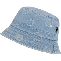 Bucket hat in light coloured denim with small, smiling faces woven in. The hat has a turned down brim.