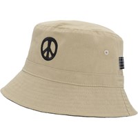 Reversible bucket hat. One side of the hat is in black, while the other side is beige. Both sides have peace sign embroideries.