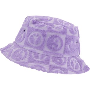 Purple terry bucket hat in a soft cotton blend with a checker pattern. The pattern is made up of happy emojis, yin/yang symbols and peace signs. This hat creates the perfect shade in the summer sun.