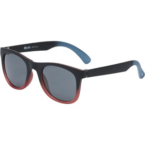 Black, classic sunglasses with a red bottom and blue at the end of the temples. Molo's sunglasses have 100% UV protection.